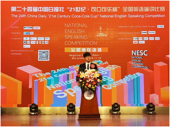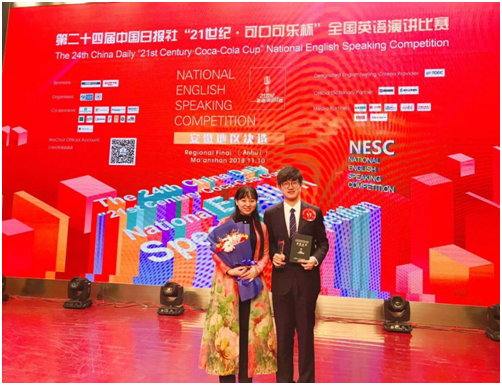 由中国日报社、可口可乐大中华区联合主办的第二十四届中国日报社“21世纪·可口可乐杯”全国英语演讲比赛安徽赛区决赛于2018年11月10日在安徽工业大学圆满结束。来自002cc白菜资讯英语专业2016级刘子源和胡近涵两名选手经过校级初赛选拔,脱颖而出,最终代表002全讯白菜大全参加省赛,并分别取得亚军和二等奖的佳绩。亚军获得者刘子源同学将代表安徽省参加明年三月的国赛。