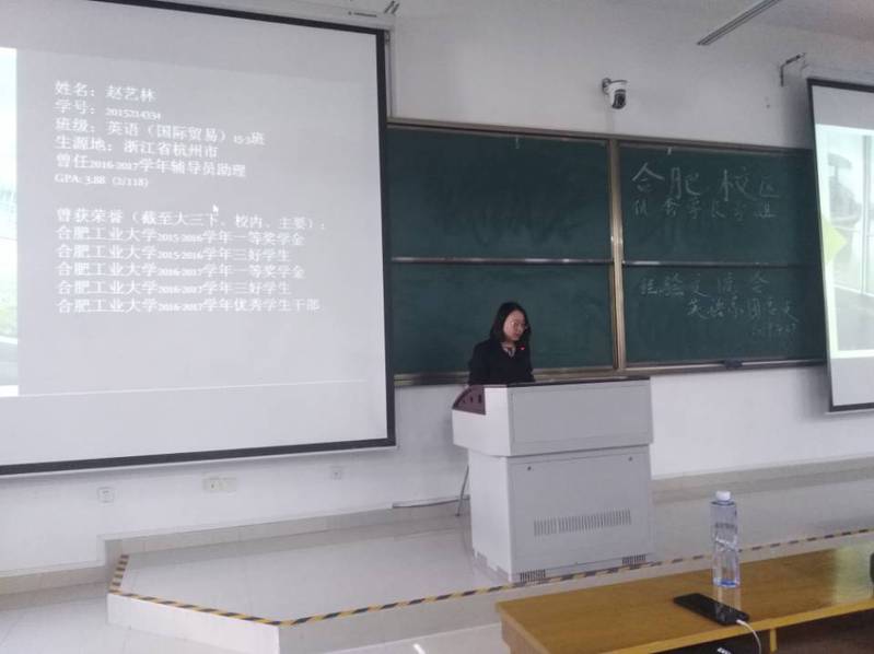 会上,6名合肥校区优秀学生代表依次发言,分别向学弟学妹们分享了保研、考研、出国、找工作的宝贵经验。赵艺林、尹丽君、汤佳佩同学分别介绍了研究生推免经历,并提出自己的建议。其中,汤佳佩、尹丽君同学分别保送到中南大学和南开大学,主要分享本专业保研的经验,介绍了保研的相关流程,预推免、夏令营、推免的相关信息,保研的注意事项等;赵艺林同学分享了跨保的经验,她推免到浙江大学国际关系专业,她认为成绩是硬指标,竞赛论文是加分项,活动是跨保的软实力。同时,赵同学还介绍了相关注意事项,推荐了参考书籍。许文清同学和葛傲宇同学分别考取了中国传媒大学英语语言文学专业和南京师范大学法律专业研究生。两位同学分享了考研经验,介绍了考研备考过程以及保持考研定力和自制力的有效技巧。最后,刘广祥同学介绍了申请爱丁堡大学的成功经验以及实习经历。