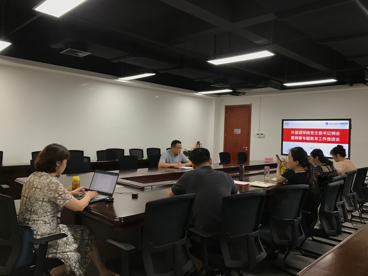 7月7日下午,002cc白菜资讯在翡翠科教楼A座1510会议室召开党支部书记例会暨师德专题教育工作推进会。会议由学院党委书记刘晓峰主持,学院教工党支部书记参加会议。