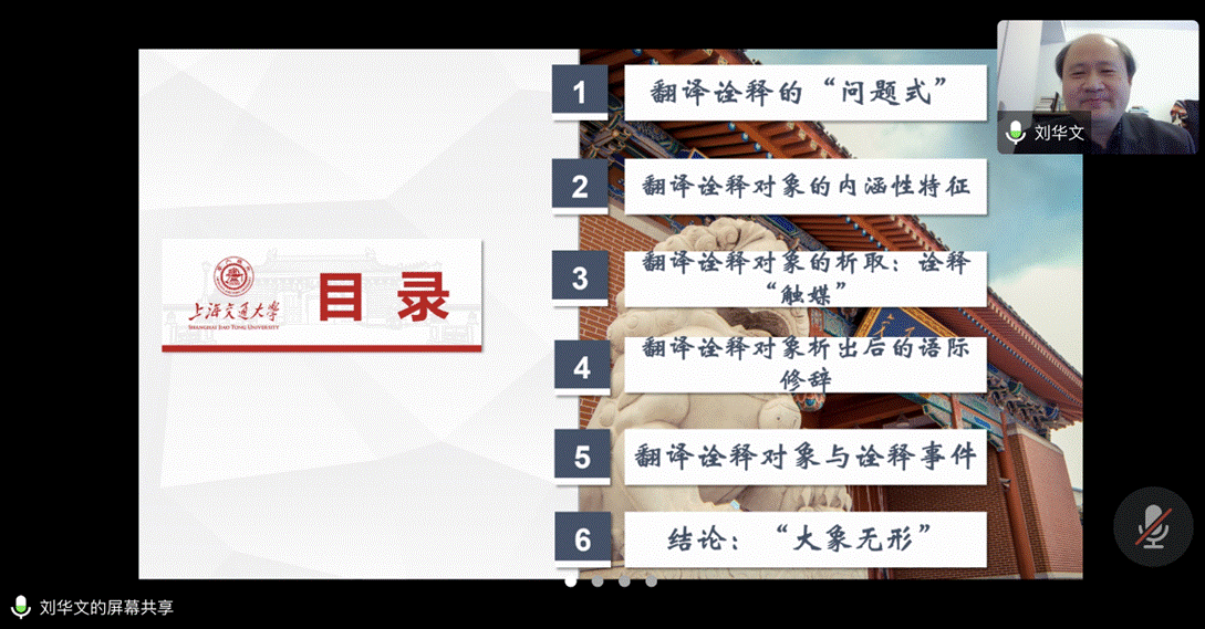 为更好地提升师生科研水平,12月12日上午,002cc白菜资讯跨文化传播与科技翻译研究中心特邀上海交通大学博士生导师刘华文教授做了一场题为“典籍翻译诠释的对象性问题”的讲座。本次讲座通过腾讯会议(会议号986 881 786)线上进行。跨文化传播与科技翻译研究中心成员、学院部分教师和研究生数十人聆听了讲座。讲座由研究中心主任韩江洪教授主持。