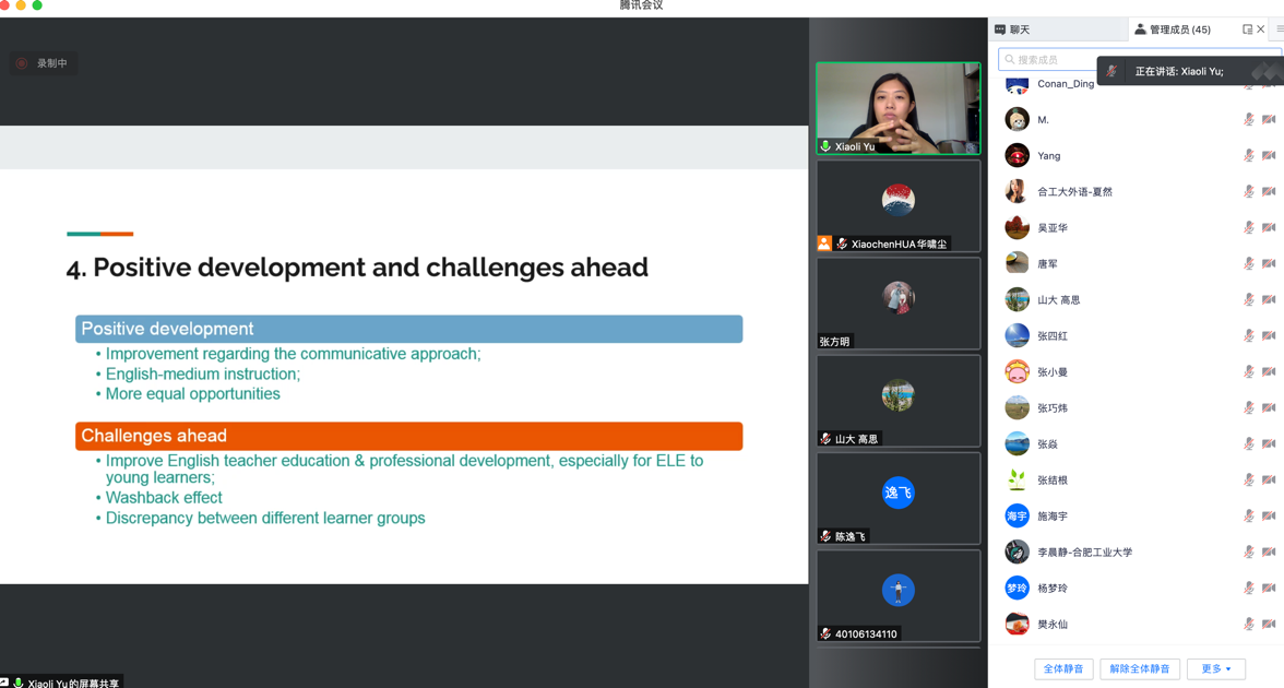 于博士的讲座分为两部分,第一部分梳理了土耳其英语教育的历史,介绍了土耳其幼儿园至大学的英语教育政策,土耳其的公、私立英语教育体系,学生英语水平,地区发展差异,以及欧盟的英语水平评价体系。第二部分介绍了她基于土耳其语境下的语料库语言学研究成果,其中包含了土耳其和英语的同源词教学,英语语法复杂度分析,土耳其英语教材和土耳其高考考试匹配度分析。最后于博士与线上与会专家进行了问答交流和讨论。002cc白菜资讯师生们对在德土耳其族裔的语言保护现状,中亚、西亚及中欧的土耳其语传播政策,库尔德语言保护工作,土耳其民众对待英语非母语的英语教师的态度,土耳其高考英语考试,土耳其精英阶层的语言身份认同等话题提出了众多问题。部分老师也通过线下留言的方式参与了互动。作为同属于非西方的亚洲国家,土耳其的语言政策和语言教育的各方面特色为白菜官网师生在各自相关领域的研究带来了有益的启发。