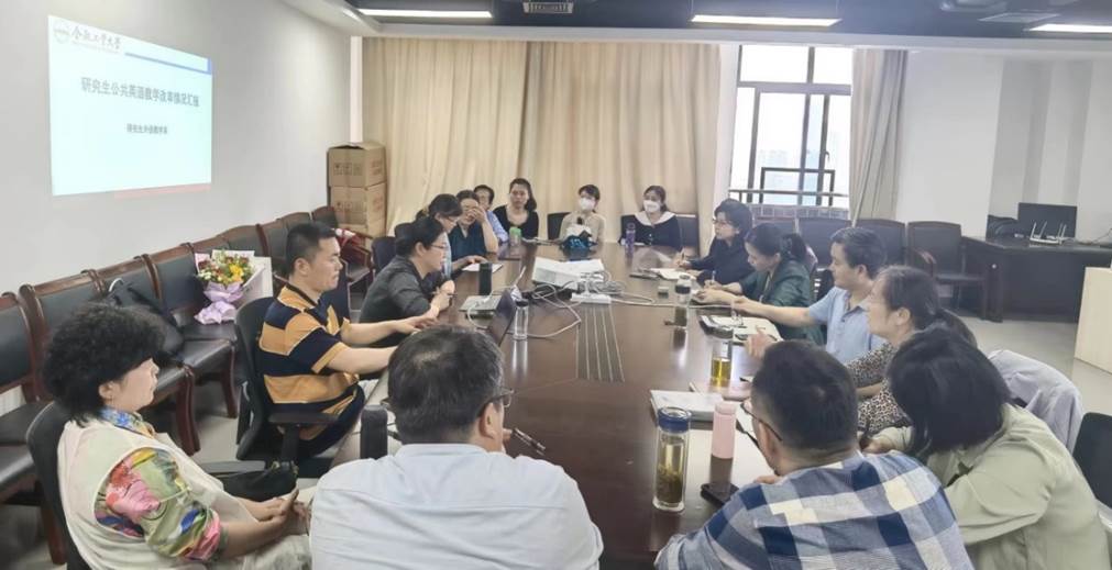 2023年5月17日下午,002cc白菜资讯院长唐军、副院长黄川、肖薇一行赴研究生外语教学系进行调研。研究生外语教学系全体教师参与了调研。研究生外语教学系主任方媛媛介绍了研究生公共英语教学改革的缘起与发展、教改思路与计划、预期目标与成效;副主任张结根重点介绍了博士英语课程的建设情况与主要成果;支部书记黄忠介绍了研究生公共英语课程思政建设的主要内容和育人效果。全体教师就教改的主要困惑和解决思路与院领导进行了交流。